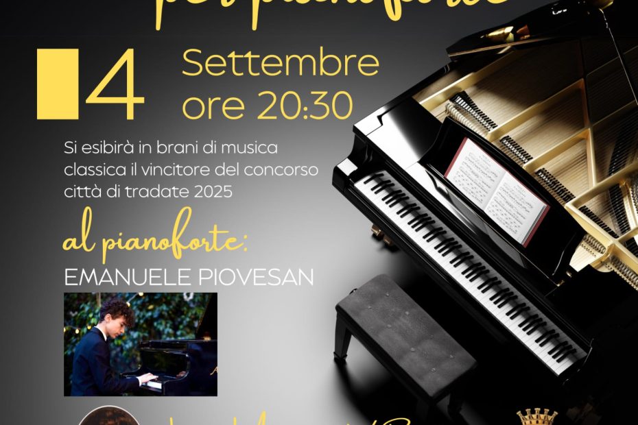 Concerto per pianoforte 4 Settembre ore 20:30 Si esibirà in brani di musica classica il vincitore del concorso città di tradate 2025 al pianoforte: EMANUELE… Leggi tutto »Concerto per pianoforte